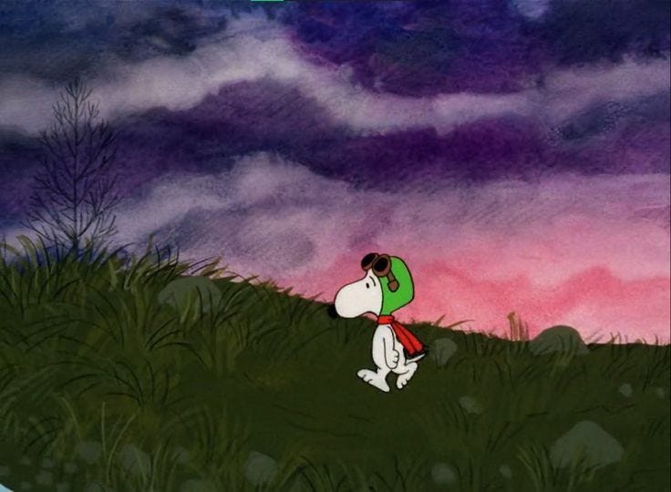 As you listen, relish these beautiful images from the wordless interlude of the episode in which the World War I Flying Ace must creep through enemy lines. Stunning.